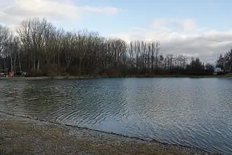 The Autobahnsee is an artificial lake that was excavated between 1936 and 1937 to obtain gravel for motorway construction. The area subsequently served as a training area for the Sturmabteilung. There were plans to build a hotel and a lido, a type of public swimming area, on the land, but they were ruined by the outbreak of the Second World War.[1]