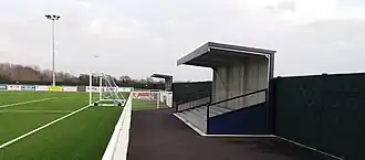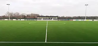 During the 2010s the club bought the site of a former gravel pit from Thurrock Council using money raised from selling Mill Field to developers.[2] The 2016–17 season was the club's last at Mill Field, as they moved to Parkside Stadium for the start of the 2017–18 season.[15] The new ground featured two seated stands on either side of the pitch, one of which was built into the clubhouse, with the clubhouse roof overhang providing cover.[1] Two covered terraces were erected behind each goal, either side of the goalmouth, whilst an artificial pitch was installed.[1] In 2018 Parkside hosted a number of games in the CONIFA World Cup.[16] The ground has also been shared by Grays Athletic (2017–2023), May & Baker (2019–2024), Cannons Wood (since 2023), Hashtag United Women (since 2023) and Hashtag United (since 2024).