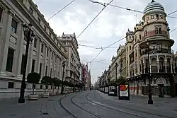 Avenida de la Constitución is an important avenue in the Casco Antiguo district of Seville, Andalusia, Spain. It starts from the square known as Puerta de Jerez and reaches the Plaza Nueva, considered the center of the city and where the historic building of the Seville City Council is located. It has a length of 600 m (0.37 mi).