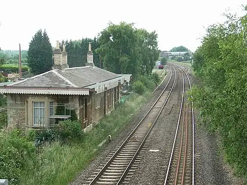 ![]() View of the station site in May 2009, with the original station building on the left. In the background a northbound train can be seen on the flyover of Aynho Junction | |||||