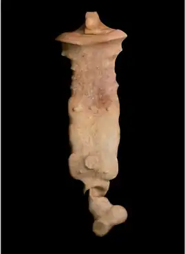 With the exhibition "Plasmorphica" (1997, Jack Shainman Gallery), Aziz + Cucher made their first foray into sculpture, displaying biomorphic, hybrid objects on floor-to-ceiling poles alongside slick, product-display-like photographs of the same forms.[5][41] The sculptures were created by casting ergonomic common items (computer mouse, phone, remote control), reworking them with organic protuberances, nodules and bulges, and then shrink-wrapping them in plastic skin.[5][42] Reviewers characterized the objects as "chilling" with a "sinister playfulness"[11] that synthesized senses of the commercial, erotic, strange and intrusive.[42][38] In Dominique Nahas's words, they were "tantalizingly suggestive of interchangeable, anonymous, polymorphic, amputated body parts, tensed muscles, prosthetic devices and feral sex toys."[11] Aziz + Cucher re-photographed the objects in the "Chimeras" series (1998–99), digitally "sheathing" them with simulated human skin detailed with photorealistic pores, moles, freckles and body hair.[3][43][44] Tema Celeste deemed them "at once disturbing and familiar … like the amputated torsos of robots given organic form."[45] The duo's "Interiors" images (1999–2001) continued to work with human skin divorced from the figure, this time through digital transformations of open, unadorned, minimalist interiors into "living" spaces covered in realistic flesh, whose doorways and hallways suggested body cavities and passages.[46][3][45]