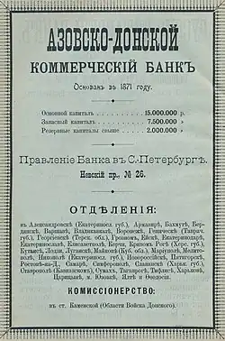 The Azov-Don Commercial Bank or Azovsko-Donskoi Commercial Bank (Russian: Азовско-Донской коммерческий банк), often referred to simply as the Azov-Don Bank, was one of the largest joint-stock commercial banks in the late Russian Empire. It was founded in 1871 in the city of Taganrog on the shores of the Sea of Azov, to which its name refers as well as the Don River. In 1903, it relocated its head office to Saint Petersburg. In late 1917 following the Russian Revolution, like all other commercial banks in Russia, it was absorbed into the State Bank with no compensation to its shareholders.[1]