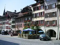 ![]() Büren with the historic wooden bridge spanning the Aare | |