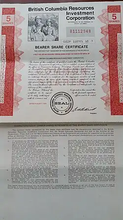 - ^ "British Columbia Resources Investment Corporation - Certificate". Columbia Basin Institute of Regional History. Retrieved 7 April 2025.