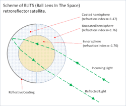 BLITS (Ball Lens In The Space) is a Russian satellite launched on September 17, 2009, as a secondary payload on a Soyuz-2.1b/Fregat, from the Baikonur Cosmodrome in Kazakhstan. The satellite is totally passive and spherical, and is tracked using satellite laser ranging (SLR) by the International Laser Ranging Service.[3] The design of BLITS is based on the optical Luneburg lens concept. The retroreflector is a multilayer glass sphere; it provides uniform reflection characteristics when viewed within a very wide range of angles, and can provide a cross-section sufficient for observations at low to medium orbit heights. A similar design was already tested on a smaller laser reflector carried on board of the METEOR-3M spacecraft launched on December 10, 2001.[4]
