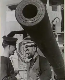 At the beginning of World War I the British Government forcibly acquired the battleship Reshadieh which Vickers had just completed for the Ottoman Government. The ship entered service with the Royal Navy as HMS Erin together with its armament which while of similar calibre to British service ordnance was of differing specification. Erin had sixteen 6-inch 50 calibre guns made by Vickers, with a muzzle velocity of 3,000 feet per second (910 m/s)[1] which was considerably greater than existing standard Royal Navy 6-inch guns. These guns were designated 6-inch BL Mark XVI in British service. Some were redeployed in World War II for coast defence.