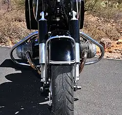 Though BMW first used oil-damped telescopic front forks in the 1930s, it chose to use Earles forks on these models. The triangular front Earles fork, named after its designer, Englishman Ernest Earles,[3] precluded any front-end dive during heavy front braking, which is common with telescopic front forks. It also worked well in sidecar duty. Though heavy and ponderous in turning, the Earles fork gave the old Beemer a steady and reassuring ride.