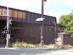 The West Shore Railroad, the Erie Railroad's Northern Branch, and the New York, Susquehanna, and Western (NYSW) all passed through the area running parallel to each other.[8] Both Erie and NYSW maintained minor stations[9] nearby 83rd Street, which crossed under the right-of-way of the West Shore. Granton Junction was located just south of the stations and was where NYSW and Erie converged after the latter had also passed under the West Shore.[10][11] For a time Granton was busy railroad junction used by both the Erie and NYSW, which shared track and stations, including the Susquehanna Transfer. The name Granton comes from a former quarry that later was the site of an important fossil find of a phytosaur.[12] Joint operations between the Erie and NYSW were controlled by GR Tower, which in 1959 was destroyed by fire, ending the relationship.[13] Originally the soap works were outfitted with rail spurs by the NYSW, but the soap company shifted more and more of its traffic to trucks, and in 1909 (apparently in retaliation for the loss of business), anonymous agents of the railroad removed the spur after temporarily imprisoning the factory's workers in a boxcar to prevent any interference.[14] In August 1922, a full Sunday evening Erie train heading south to Pavonia Terminal was struck by bombs thrown at it in what was considered an act of sabotage and an attempt to cause a collision.[15][16]