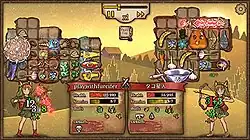 In the battle phase, the player's character battles against another player's character asynchronously without player control.[5] Items will trigger at specific intervals for each item and based on other nearby items. Items can provide a number of benefits including dealing damage to the other player, adding armor to absorb attacks, giving the player health regeneration or other buffs (such as increased speed or accuracy), or inflicting debuffs on the opponent (such as poison). The first player to run out of health loses, and the other player wins.[2] Battles typically last for about 10–20 seconds.