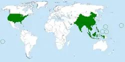 Endemic to Southeast Asia, B. dorsalis is a highly invasive pest species that now has a presence in at least 65 countries. It has also been introduced to Hawaii, the Mariana Islands, and Tahiti. The fly is also found in most countries of sub-Saharan Africa.[11] From 1910 to 1990, the fly species was only observed in 5 countries; however, in the last three decades, the rate of spread by B. dorsalis has sharply increased, with the species invading an additional 70 countries.[12]