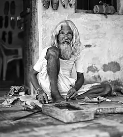 Baddha Konasana (Sanskrit: बद्धकोणासन; IAST: IAST: baddhakoṇāsana), Bound Angle Pose,[1] Butterfly Pose,[2] or Cobbler's Pose (after the typical sitting position of Indian cobblers when they work),[3] and historically called Bhadrasana,[4] Throne Pose,[4] is a seated asana in hatha yoga and modern yoga as exercise. If the knees rest on the floor, it is suitable as a meditation seat.[4]