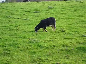 The Badger Face Welsh Mountain (Welsh Defaid Idloes [ˈdevaɪd ˈɪdlɔɪs]; also known as Badger Faced Welsh Mountain or Welsh Badger-faced) is a distinct variety of the Welsh Mountain breed of domestic sheep bred for sheep farming in Wales.[1] It is a hardy upland breed known for producing a high percentage of twins and triplets under good conditions. It appears in two sub-varieties of its own: the Torddu ([tɔrˈðiː], "black-bellied"), which has a white fleece with dark face and belly, and the Torwen ([tɔrˈwɛn], "white-bellied"), which has a black body with a white belly and white stripes over the eyes.[2] The Torddu is the more common of the two types. In both types, ewes are polled and rams are horned.[3] Although this breed grows wool, it is primarily raised for meat.[4]