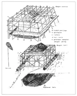 Bagan is made up of several components: Nets, shack (made of woven or wooden material, sometimes without roof), serok (handle net) and lights. The nets are generally 9 x 9 m wide, with 0.5 – 1 cm mesh, made of cotton or nylon yarn. These nets are fastened to a rectangular frame made of bamboo or wood. The shack (anjang-anjang) is made of bamboo/wood whose underside is 10 x 10 m, while the upper part is 9.5 x 9.5 m (for stationary bagan). At the deck there is a roller to lower and lift the net. Catching with a bagan is only done at night (light fishing), especially on the dark moon phase by using lights as fishing aids.[1]