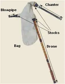 A set of bagpipes minimally consists of an air supply, a bag, a chanter, and usually at least one drone. Many bagpipes have more than one drone (and, sometimes, more than one chanter) in various combinations, held in place in stocks—sockets that fasten the various pipes to the bag.