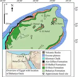 The Bahariya Formation forms the base of the depression, the lower part of the enclosing escarpment and all of the small hills within.[5] The type section for the formation is found at Gebel El-Dist, a hill at the northern end of the Bahariya depression.[6]