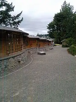 The first part of the memorial to be constructed was an outdoor cedar "story wall" with the names of all 276 Japanese Americans resident on the island at the time.[1] The groundbreaking ceremony for the wall was held on March 30, 2009, the 67th anniversary of the internment. Fumiko Hayashida (then 98), the oldest surviving internee, spoke at the ceremony.[1][4] The wall was designed by local architect Johnpaul Jones, an American Indian and the principal of Jones and Jones Architects.[3][7] Jones also worked on landscape architecture in the vicinity of the memorial; he aimed for natural landscaping, planting native species including sword fern, mahonia, salal, and shore pine.[7] Local artist Steve Gardner created friezes to be placed on the wall, depicting some of the scenes of residents being herded onto the ferries; he stated that the project "sucked me in in a way I hadn't thought about. This really is a story about American citizens."[5] The memorial was opened to the public on July 30, 2011.[3]