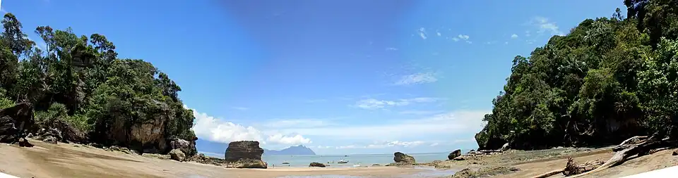 Bako National Park (Malay: Taman Negara Bako) is a national park in Kuching District, Kuching Division, Sarawak, Malaysia. Established in 1957, it is the oldest national park in Sarawak. It covers an area of 27.27 square kilometres (10.53 sq mi) at the tip of the Muara Tebas peninsula at the mouth of the Bako and Kuching Rivers. It is approximately 40 kilometres (25 mi) by road from Kuching. Millions of years of erosion of the sandstone have created a coastline of steep cliffs, rocky headlands and stretches of white, sandy bays. Wave erosion at the base of the cliffs has carved many of the rocky headlands into fantastically shaped sea arches and seastacks with colored patterns formed by iron deposition. The most famous of them was shaped like a cobra's head which could be spotted on a boat ride from the headquarters or one of the beaches. This collapsed in 2024 and is no longer present.[1] Some of these rock formations can be seen on entry to the Teluk Assam Beach, which fronts the park. The park can only be reached by a 20-minute boat ride from the village of Kampung Bako. It is often visited as a day-trip from Kuching, though accommodations (campground and forestry service bungalows) are available.