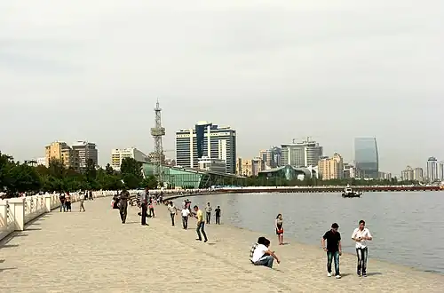 The park stretches along a south-facing bay on the Caspian Sea.[2] It traditionally starts at Freedom Square continuing west to the Old City and beyond. Since 2012, the Yeni Bulvar (new boulevard) has virtually doubled the length to 3.75 km, extending the promenades to National Flag Square.[3] In 2015 White City Boulevard added a further 2 km to the east of Freedom Square and reports have suggested that eventually the boulevard might be as long as 26 km, including Bibiheybət.[4][5]