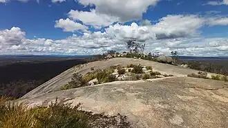 The park is named after its most prominent feature, Bald Rock, which is a large granite outcrop rising 260 metres above the surrounding landscape and almost 1300 metres above sea level.[2] Measuring about 750 metres long and 500 metres wide this is the largest granite monolith in Australia.[3][4] Access to the rock is provided by a sealed road into the park and walking tracks to the summit. Two tracks are marked, a steep one up the exposed face, or an easier gradient through bushland around the back. The Bungoona Walking Track, constructed in 1980, ascends gently along the eastern side of Bald Rock, meandering through forested areas. Along the way, it traverses granite boulder formations, including a moss-covered arch adorned with ferns and orchids. The summit offers panoramic views of the surrounding bushland, but vegetation on top prevents a full 360° view. The views are so expansive, mountains as far north as the Queensland/New South Wales border can be seen, such as Mount Barney, Mount Lindesay and Flinders Peak, and as far south as Mount MacKenzie, south of Tenterfield.