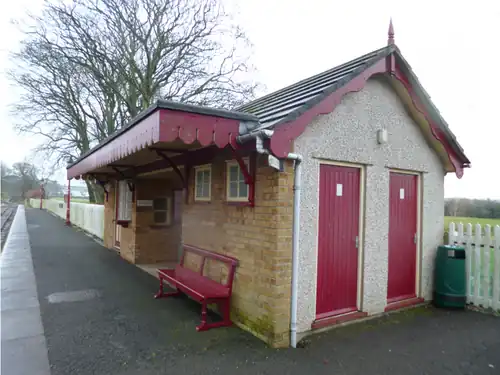 A modern bus shelter was installed on the up platform in 2002 and in an attempt to make it blend with the environment was painted maroon rather than the standard green of other such edifices; it has been redundant since trains ceased to call at the up platform following the close of the 2015 season but remains in situ, prone to vandalism attacks and has had its glazed panels smashed and replaced on several occasions rather than simply removing it.