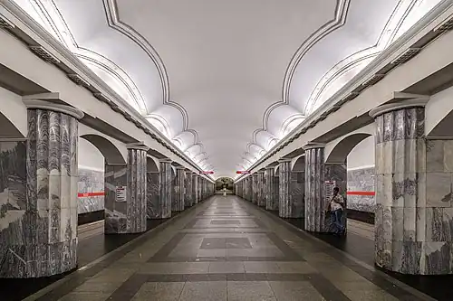 Baltiyskaya is an underground bore-tunnel tri-span station with one exit and middle tunnel of full length. It is situated 57 metres (187 ft) under surface level. The exit feeds into Baltiysky Rail Terminal building. A second exit, which will lead from the opposite side of the underground platform, is also planned. For the decoration of the station Ural marble was used, representing the silver colour of the sea. Baltiyskaya station was opened on 15 November 1955 as the first part of Saint Petersburg's metro system. The project name for the station had been Baltiyskiy Vokzal.