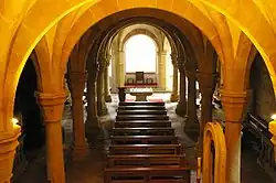 Construction of this first cathedral had begun in 1002, with work starting on two crypts. It was consecrated on Heinrich's birthday, on 6 May 1012. This first cathedral was a cruciform basilica with the main choir in the west and a second to the east, each above a crypt. Two towers were located on the eastern façade. The nave was covered by a flat wooden ceiling. This cathedral was smaller than the current structure (only around 75 m long). This cathedral burned down in the Easter week of 1081. Whilst the interior art was completely destroyed, damage to the structure was relatively minor. It was quickly rebuilt – by 1087 it was possible to hold a synode here.[1]: 204 Bishop Otto had the church rebuilt completely and it was reconsecrated in 1111.[2][3]: 5