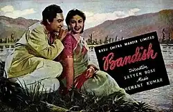 Bandish (transl. Restriction) is a 1955 black and white Indian Hindi-language film[1] The film stars Ashok Kumar, Meena Kumari, Daisy Irani in lead roles. The film was directed by Satyen Bose.[2]