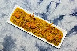 The Chittagong Hill Tracts are home to tribes with their own culture and cuisine.[38][39] Chakma cuisine uses sidol, a paste made from fermented shrimps and fish, and suguni, dried shrimp or fish.[40] Their dishes use more herbs from the hills more than the spices common in Bengali dishes.[40] Important seasonal ingredients include wild mushrooms and the Flowers of ginger and turmeric plants.[40] Sumoh gorang is a dish cooked in bamboo and Hebaang is baked in banana leaves in a mud oven.[40] Marma cuisine uses a paste of dried fish called nappi.[4] Rice beer is a popular drink.[4]