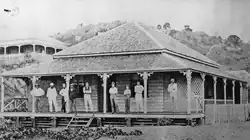 The second bank building and a manager's residence were constructed in 1869 on the corner of Wickham Street and The Strand on the present Townsville Customs House site. While these premises were well placed for the sea breezes, the building was again deemed unsuitable because of the distance from the centre of town and the difficulty of access via Wickham Street.[1]