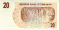 $20 | 152 × 81 mm | Navy blue | Domboremari with trees, giraffe, Salisbury as capital, Krogh as signature | African elephant, Victoria Falls | Zimbabwe Bird (profile angle, short neck) | 1980 | 14 April 1982 | 21 August 2006 | |