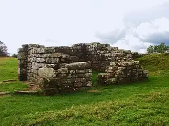 This western part of Hadrian's Wall was originally built using turf starting from 122 AD.[4] The stone fort was built some time after the wall, in the usual playing card shape, with gates to the east, west and south. It was 7.5 miles (12.1 km) east from Camboglanna (Castlesteads) fort and 6.5 miles (10.5 km) from Aesica (Great Chesters).