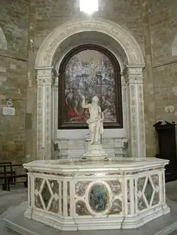 The façade is decorated with horizontal bands of white and dark green marble.[2] The Romanesque Portal has been attributed to a follower of Nicola Pisano.[3] The sixteenth-century altar inside has been assigned to Balsimelli da Settignano, using a design by Mino da Fiesole. It has a painting (partially damaged during World War Two of the Assumption of the Virgin by Niccolò Circignani. Beside that altar is a marble font (1502) is by Andrea Sansovino. The Ciborium (1471) was completed by Mino da Fiesole. The baptismal font (1759) by Giovanni Vaccà.[4] Above it rises a statue of St John the Baptist (1771) by Giovanni Antonio Cybei. The holy water receptacle is an ancient Roman sarcophagus.