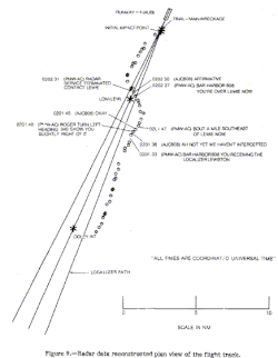 Examination of radar data from Portland showed that after Flight 1808 turned to a heading of 340° to intercept the approach, it flew through the approach course and had to make a 60° right turn less than 1 nautical mile (1.9 km; 1.2 mi) from the outer marker to turn onto the approach course. Altitude data from the aircraft’s transponder showed that Flight 1808 did not begin its descent to intercept the precision approach until after passing Lewiston, when the plane was already above the glide slope for the approach. This may have caused the flight crew to rush both the descent and the approach and descend too steeply. The actual altimeter settings on both the captain's and the first officer's altimeters could not be determined because of fire and impact damage. The aircraft flew into trees 4,007 feet (1,221 m) from the end of Runway 4 and struck the ground 440 feet (130 m) to the right of the extended runway center line. There were no survivors.