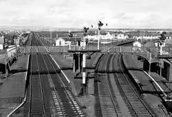 Barassie station originally had four platforms, two of which were on the former Kilmarnock and Troon Railway line from Kilmarnock. These platforms went out of use after the local passenger service over the branch was withdrawn by British Rail on 3 March 1969.[3] They are now derelict & fenced off, but the two platforms on the Ayr line are still operational today. Barassie was a staffed station until the line was electrified in 1986, but the main buildings have since been demolished and there are now only waiting shelters in use on each platform.