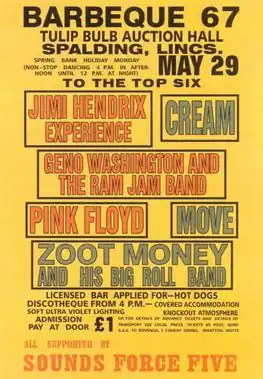 Towards the end of 1966, Grantham promoter, former footballer Brian Thompson,[2] set about booking Geno Washington and the Ram Jam Band and the Move for a Bank Holiday concert in Spalding. Their management persuaded Thompson to also book three relatively unknown acts at that time: Pink Floyd, the Jimi Hendrix Experience and Cream.[1]