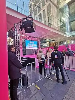 Leading up to the release, pink billboards, blank apart from the film's release date, appeared worldwide, and a real-world "Barbie Dreamhouse" in Malibu, California became available to rent through Airbnb.[165] On July 14, 2023, SAG-AFTRA, an American labor union of film, television and voice actors, declared a strike action, effectively halting any promotional event that involved the guild's members.[166] Robbie showed her support for the action.[167] SAG-AFTRA President Fran Drescher later claimed that the studios "duped" the guild into accepting a 12-day extension for negotiations to continue promoting summer films like Barbie.[168]