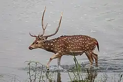 The Bardiya National Park is home to at least 53 mammals including Indian rhinoceros, Indian elephant, Bengal tiger, barasingha, and Gangetic dolphin.[5] A rusty-spotted cat was sighted for the time in summer 2012.[6] A fishing cat was recorded in Babai River valley in winter 2017.[7]