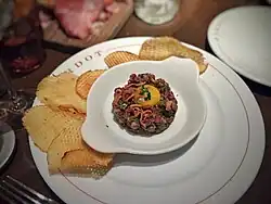 Dining service starts with a demi-baguette with butter. Salads include frisée with lardons and a caesar salad with endive and King crab.[7][8] Appetizers include duck a l'orange wings, onion soup gratinee with truffles and cave-aged gruyere cheese, steak tartare, and escargot in puffed pastry.[2][3][7][9][12] An additional appetizer includes Lobster Thermidor for two.[2] Entrees include croque madame, sautéed skate wing, gnocchi with mushrooms and goat cheese, and salade niçoise with yellowfin tuna.[2][12] Steak frites are offered with various cuts of meat, including flat iron, ribeye, and filet.[2] Five sauces are available for the steak frites, including blue cheese fondue and bordelaise.[8] Frites are cooked in duck fat.[12] There is a roasted chicken sourced from Bill Bobo's chicken farm. The chicken's preparation is similar to Peking duck.[9] Sides include a mushroom and leek bread pudding.[2] The bar menu includes a hamburger made with prime rib, oysters and salmon tartare.[13]