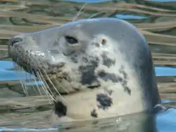 The island is one of the best places in Gwynedd to see grey seals. In mid-summer over two hundred can be seen, sunbathing on the rocks or bobbing in the sea, and about 60 pups are born each autumn. Their sharp teeth and strong jaws are perfect for breaking the shells of lobsters and crabs which dwell in the waters. It is also possible to spot bottlenose and Risso's dolphins, and porpoises. The currents around the island are responsible for flushing in food-rich waters, and the Whale and Dolphin Conservation Society has been carrying out surveys since 1999 to find out which areas are particularly important for feeding and nursing calves.[12]
