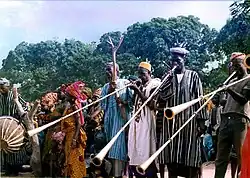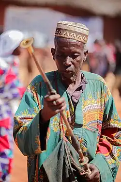 The Gbangba, danced by young Wasangari aged between 18 and 25, is identified by its solemn, mournful rhythm. It was for-merly used to announce the death of a king and to accompany the preparations for burial ceremonies. A war dance, it also an-nounces the start of a conflict. The Fulbe carry out the Sinna which imitates flagellation, and the Gesegesere.