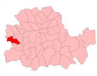Barons Court was a borough constituency of the parliamentary County of London. It was created from parts of three abolished constituencies in 1955: the bulk of Hammersmith South and parts of Fulham West and Fulham East. It was composed of the northern end of the Metropolitan Borough of Fulham (Barons Court, Margravine, and Lillie wards) and the southern section of the Metropolitan Borough of Hammersmith (Broadway, Brook Green, Grove, and Ravenscourt wards). It did not include the whole of either Metropolitan Borough.[1]