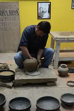 This style of pottery is made in San Bartolo Coyotepec and a large number of small communities in the surrounding valley, where the clay that gives it its color is found.[5][11] This community is located 11 kilometres (6.8 mi) south of the city of Oaxaca,[5] with about 600 families in the area dedicated to the craft.[4] In addition to a number of family workshops, including Doña Rosa's, the Mercado de Artesanias is an important attraction which brings visitors from many parts of Mexico and other countries. A group of fourteen people exhibit and sell barro negro objects. Some of these products include vases, animal figures and jars. Demonstrations of pottery making are held there as well.[12] In 2005, the Museo Estatal de Arte Popular de Oaxaca (State Museum of Popular Art) was opened here. It has one of its three halls dedicated to barro negro, with pieces from the Monte Albán era to the present day.[4] In 2009, San Bartolo Coyotepec held its first Feria Artesanal de Barro Negro (Crafts Fair of Barro Negro) with the participation of over 150 artisans.[13]