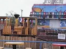 The site would be occupied by the famous and much smaller Log Flume ride built during 1980. Wooden beams from the Scenic Railway were salvaged, stored and reused in the construction of the Flume and other beams formed the basis of the Wacky Goldmine (now renamed the Haunted Mine) which was destroyed in a controlled fire in September 2014.[2] Log Flume would in turn be demolished in April 2015.[3]