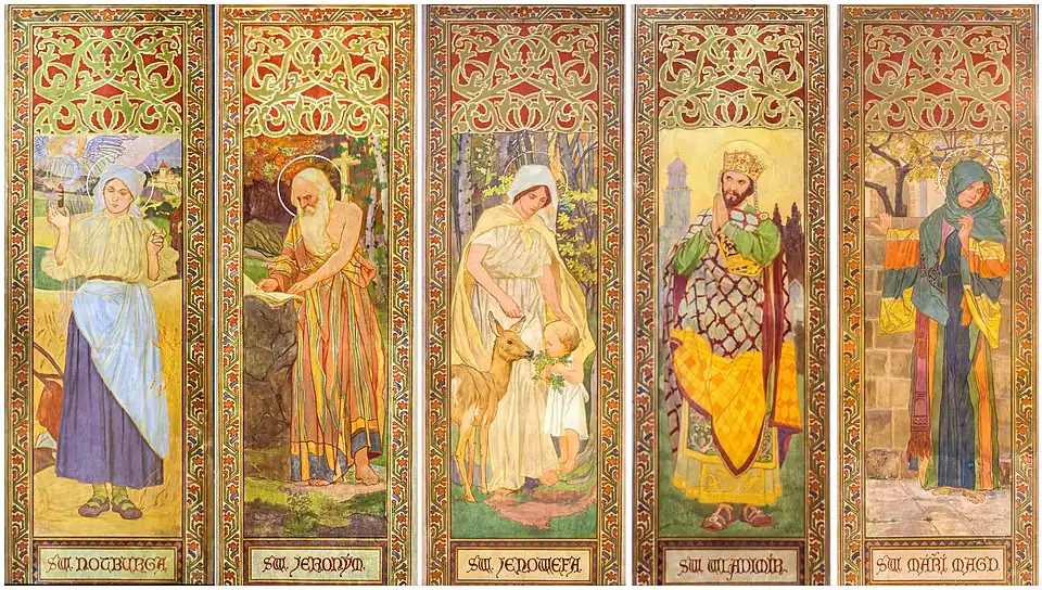 Seemingly every inch of the walls, pillars and ceilings is covered with the ornate, flowing decoration of the painter František Urban and his wife Marie Urbanová-Zahradnická inspired by Alfons Mucha. Nameless winged women flank the archways from the nave and fill the vault sections of the arcades. Up the pillars and along every picture's border run floral patterns and colourful ribbons. The vivid greens and browns which cover the entirety of the interior create a feeling of being inside a forest. The ceiling of the nave is dark green, as if it is a canopy in shadow. Even the brown wooden benches on the ground for the beholders of church services are ornately carved with oak leaves.[4]