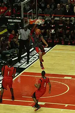 An alley-oop is an offensive play which involves one teammate lofting the ball up near the rim in anticipation of another teammate jumping up to catch and dunk it. Because this move requires both teammates to know what the other is thinking, the alley-oop is a rare and exciting play. The alley-oop first dates back to the mid-1950s when K. C. Jones and Bill Russell teamed up to perform it while they were college teammates.[11][12] Point guard Chris Paul, and big men Blake Griffin and DeAndre Jordan, were known for their spectacular alley-oops; during their shared time with the Los Angeles Clippers their team earned the name "Lob City". Another notable duo known for using this play is LeBron James and Dwyane Wade during their time at the Miami Heat.