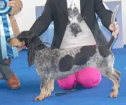 The Basset Bleu de Gascogne (French pronunciation: [bɑsɛ blø də ɡasˈkɔɲ]), also known as the Blue Gascony Basset, is a long-backed, short legged breed of dog of the hound type. A French native breed, it is rare outside its homeland. It is recognized internationally by the Fédération Cynologique Internationale, in the UK by The Kennel Club, and by the United Kennel Club in the United States. The "bleu" of its name is a reference to its coat which has a ticked appearance.