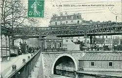 The Lifting bridge of the Rue de Crimée or Pont de Flandre, a lifting bridge weighing 85 tons built in 1885, separates the two basins. It allows traffic on the Rue de Crimée to cross the canal and connects the Quai de l'Oise on the north-west side to the Quai de la Marne on the south-east side. When the bridge is raised pedestrian traffic can still continue on a fixed elevated walkway. At the time of its construction it was the third largest lifting bridge to be built in France.[5] It is now the last one in Paris and is registered as an historical monument.[6]