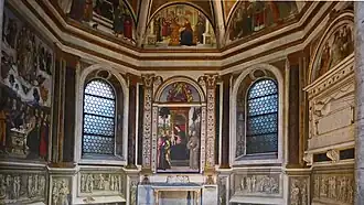 The five lunettes are decorated with Stories from the Life of the Virgin, now much damaged and repainted.[2] The great fresco of the Madonna and Child Enthroned with Saints Augustine, Francis, Anthony of Padua and a Holy Monk above the altar, with a lunette that shows the God the Father Blessing, is enclosed by a white marble frame with rich golden decorations. There are two arched windows on the two adjacent walls with splays decorated with grotesques. The first wall is decorated by the fresco of the Assumption of the Virgin Mary while last section is covered by the funeral monument of Giovanni Basso (†1483). That was created around 1485 by the workshop of Andrea Bregno. Its design is analogous to the now truncated tomb of Pietro Mellini in the Mellini Chapel and other similar monuments in Rome. The handling is less refined when closely examined, but still a beautiful work.[3]