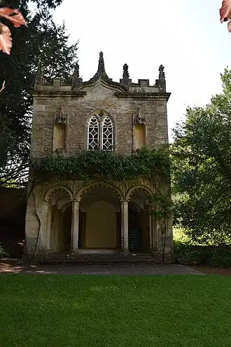 The Georgian era saw a heightened interest in the physical and mental benefits of cold water bathing, and those that could afford to do so constructed bath houses, or plunge pools, on their estates.[12] The physician John Floyer, who treated a young Samuel Johnson, wrote, "No part of Physick is more ancient than Cold Bathing, since we find many descripts of its good effects in our oldest authors...a Cold Regimen is proper to Cold Countries".[13] The Corsham bath house is of two storeys, and open to the elements on its main frontage.[3] Nikolaus Pevsner, in his Buildings of England, described it as "a charming little building..in a half-Gothic, half-Elizabethan style".[14] The entrance front has three Gothic arches forming an open loggia. The sunken bathing pool is on the ground floor, and a changing room is above. A passage at the rear of the bath house leads through to the Bradford Gate, a genuinely medieval porch recovered from a demolished manor house in Bradford-on-Avon and erected at Corsham in 1967.[14][15] The passageway ceiling is decorated with the remnants of patterns of moss and fir cones in a rustic style, which date from Browns's original construction.[14] The bath house is a Grade I listed building.[3]