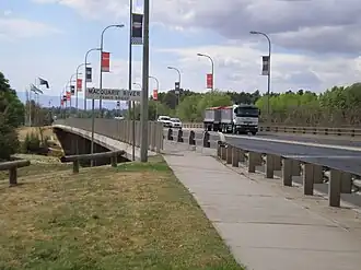 The Macquarie River divides Bathurst with the CBD located on the western side of the river. Four road bridges and two rail bridges span the river within the city area. From the upstream side they are: Macquarie River Railway Bridge (built in 1876[38]) closed in 2011 (replaced with a new concrete single track rail bridge structure alongside and brought into use in 2011); the four lane Evans Bridge which opened in 1995; the Denison Bridge opened in 1870 (closed to road traffic and now a pedestrian bridge); the Gordon Edgell Bridge, a low−level bridge located on George Street; and Rankens Bridge at Eglinton.